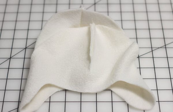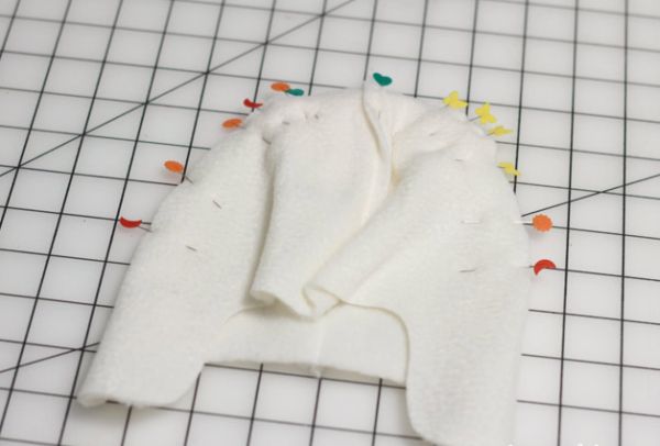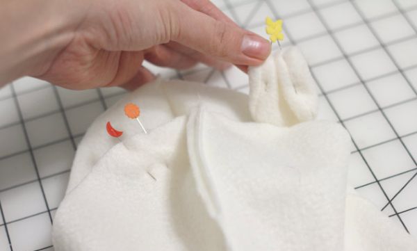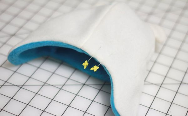 Logo após, posicione uma orelha de cada lado da touca, mas com as orelhas com a parte arredondada para baixo e a base para cima. E prenda com alfinetes para costura.