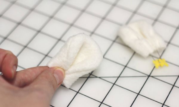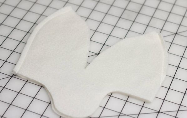 Em seguida, posicione duas partes das orelhas, com os lados do direito do tecido para dentro e costure ao redor, deixando a base sem costura. Depois vire as peças para o lado direito do tecido e prenda a base formando a “dobrinha” da orelha.