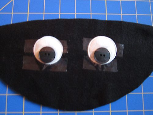 Em seguida, posicione os dois botões pretos sobre os olhos, prenda com fita adesiva e pregue-os.
