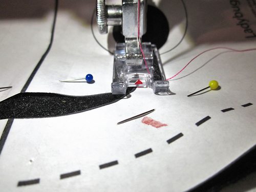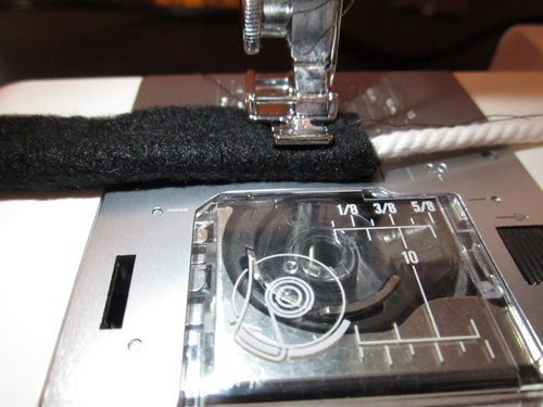 Em seguida, costure um pedaço de tecido preto em um pedaço de cordão.