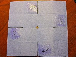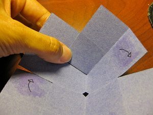 Em seguida, corte, com o auxílio da tesoura, um furo no centro, mas no formato de um losango. E depois, aplique cola nas marcações e siga as setas para colar.