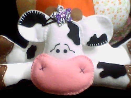 Para criar um efeito especial, faça duas costuras com linha no nariz da vaquinha com linha preta, em formato de “X”. Insira uma fita no centro da cabeça e faça os olhos com feltro preto ou com tinta.