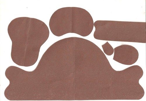 Essas são as partes necessárias para montar o corpo da vaquinha. Use linha bege para costurar a parte das patas e linha branca para alinhavar as manchinhas da vaca.