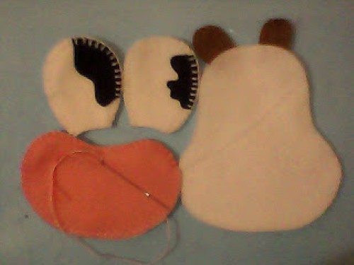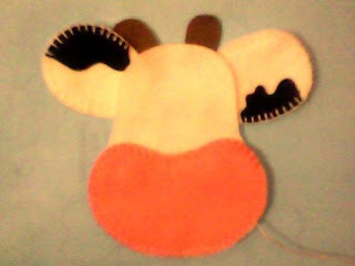 Esse deve ser o resultado da carinha da vaquinha de feltro, reserve e comece a monta as outras partes. O ideal é fazer duas partes para cada peça para conseguir preencher ela depois com manta acrílica.