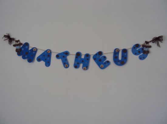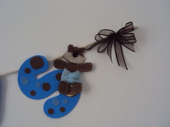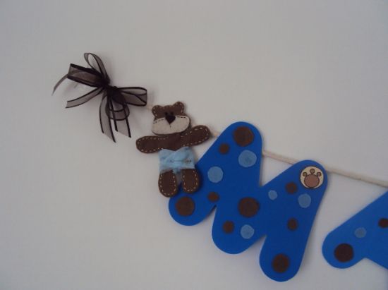 Para finalizar, cole nas duas pontas do cordão um ursinho e um laço (já montado com dois lacinhos). E está pronto seu varal para chá de bebê! Para as meninas você pode fazer a base (as letras do nome) e os enfeites com tonalidades de rosa, vermelho e branco ou com as cores que quiser. E também pode fazer este varal para vender, e neste caso poderá fazer vários nomes (pelo menos os mais comuns) e deixar guardado, assim se aparecer um pedido de última hora você consegue cumprir o prazo combinado.