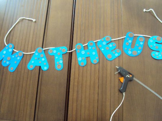 Após todas as letras estarem enfeitadas, cole-as em um pedaço do cordão de algodão com a cola quente.