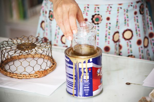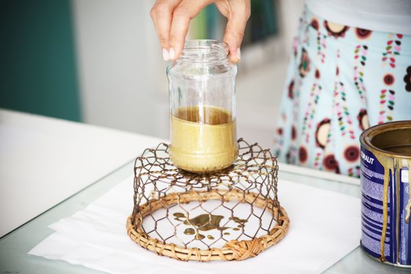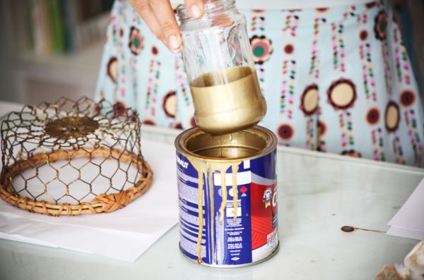 Comece lavando muito bem o vidro com água e sabão e secando-o com um pano limpo. Depois mergulhe o fundo do pote ou do vaso na lata do esmalte sintético dourado.
