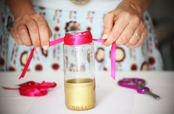 Agora, corte um pedaço da fita decorada escolhida (com tamanho suficiente para dar várias voltas na borda do vidro ou do vaso) e amarre dando um laço bem bonito para garantir um bonito acabamento.