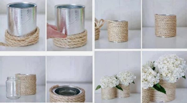 Cole a corda ao redor de toda a lata, com o auxílio da pistola de cola quente. Para finalizar a sua peça, coloque o copo ou outro recipiente escolhido dentro da lata e coloque as flores em seu novo vaso. E está pronto!