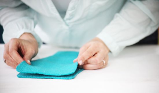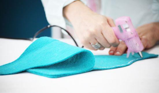 Em seguida, aplique cole quente em uma pequena parte da lateral e coloque um feltro sobre o outro. Pressione até a cola secar.