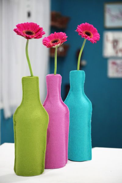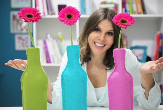 Em seguida, para finalizar o seu artesanato, “vista” a garrafa com a capa de feltro que você acabou de fazer. E coloque água nas garrafas e brinque com as cores. E está pronto! E a partir desta ideia você pode fazer vários vasinhos estilizados e coloridos para a sua casa.