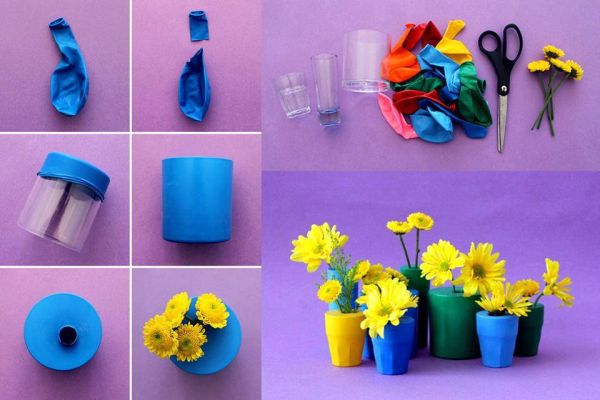 Encape um copo com bexiga e consiga um estilizado vasinho decorativo.