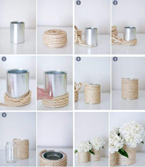 Comece separando todos os materiais que você vai utilizar em seu artesanato. Cole corda ao redor de uma lata, com o auxílio da pistola de cola quente. Para finalizar a sua peça, coloque o pote dentro da lata e coloque as flores escolhidas. E está pronto! Tenha em mãos um vaso sustentável que faz bonito em qualquer lugar.
