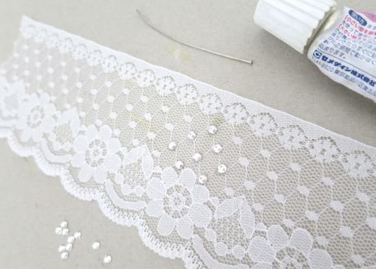 Corte o bico de renda ou o entremeio de renda com um tamanho que consiga circundar a vela escolhida. Depois comece a colar os strass ou as pedrarias escolhidas no pedaço de renda cortada. Nesta etapa você pode decorar o pedaço de renda da maneira que você quiser com as pedrarias escolhidas.