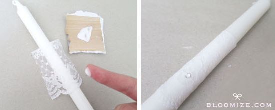 Continuando com o desenvolvimento da vela decorada com renda passo a passo, cole o pedaço de renda ao redor da vela escolhida. Aplique bastante cola e prenda o pedaço de renda na vela, com o auxílio de alfinetes para costura.