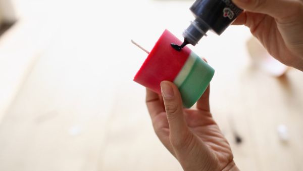 Em seguida, para finalizar a sua peça, desenhe as sementes da melancia em toda a parte vermelha de vela, com o auxílio da tinta em bisnaga com a cor preta. E está pronto!